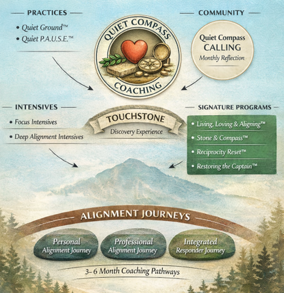 Every Quiet Compass offering is designed to meet people where they are while providing a meaningful path forward. Some begin with grounding. Some need focused clarity. Some are ready for deeper alignment and sustained transformation.